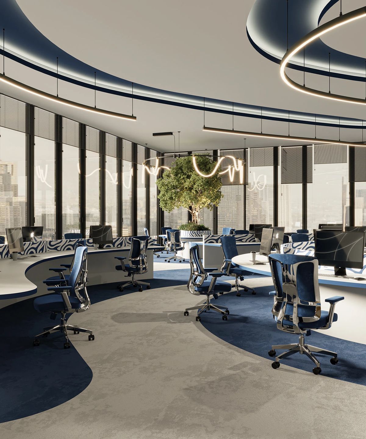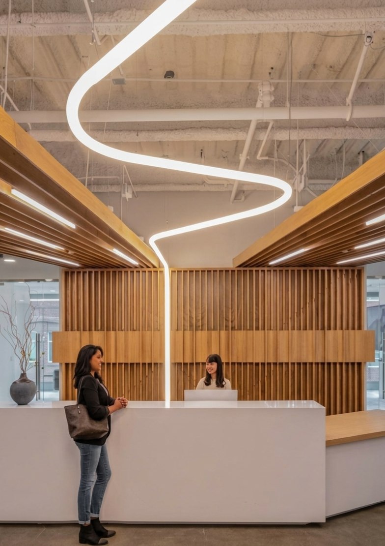 4. Focalización Lumínica: Uso de acentos de luz en el plano superior para jerarquizar puntos de decisión (recepción, ascensores).