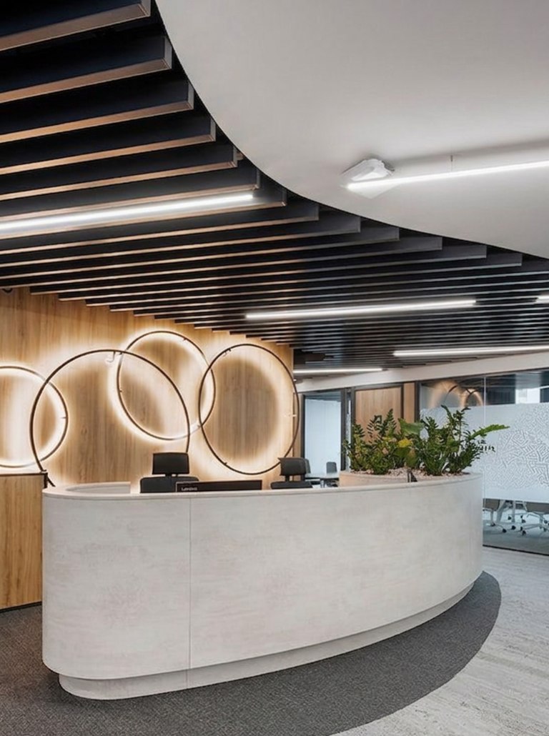 2. Líneas de Tensión en Techos: Implementación de iluminación lineal o lamas de madera que dibujen la trayectoria hacia los núcleos de circulación.