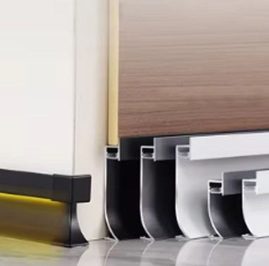 Resistencia a Impactos: El aluminio protege la base del muro contra golpes accidentales de aspiradoras o muebles, actuando como un «parachoques» arquitectónico.