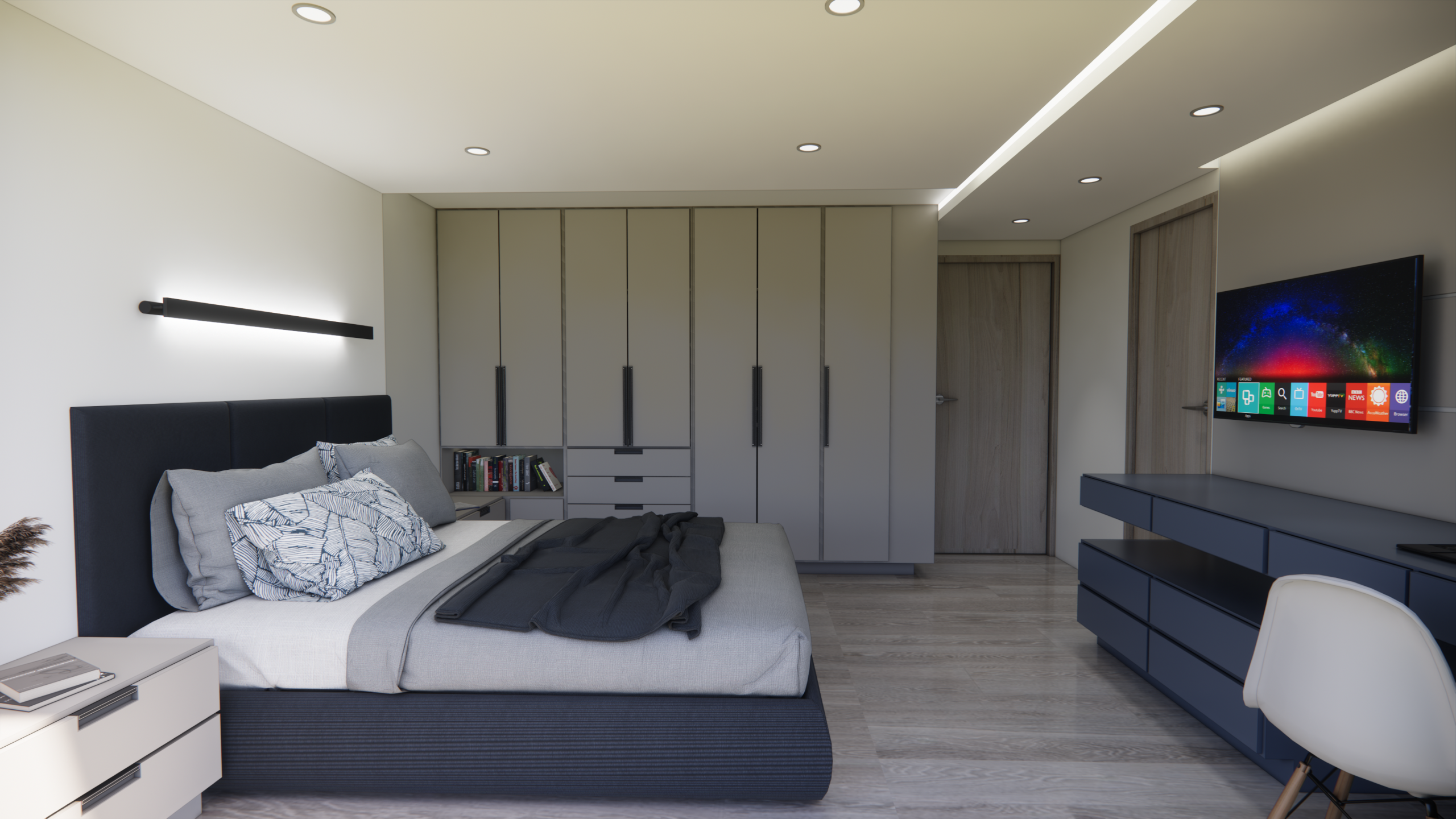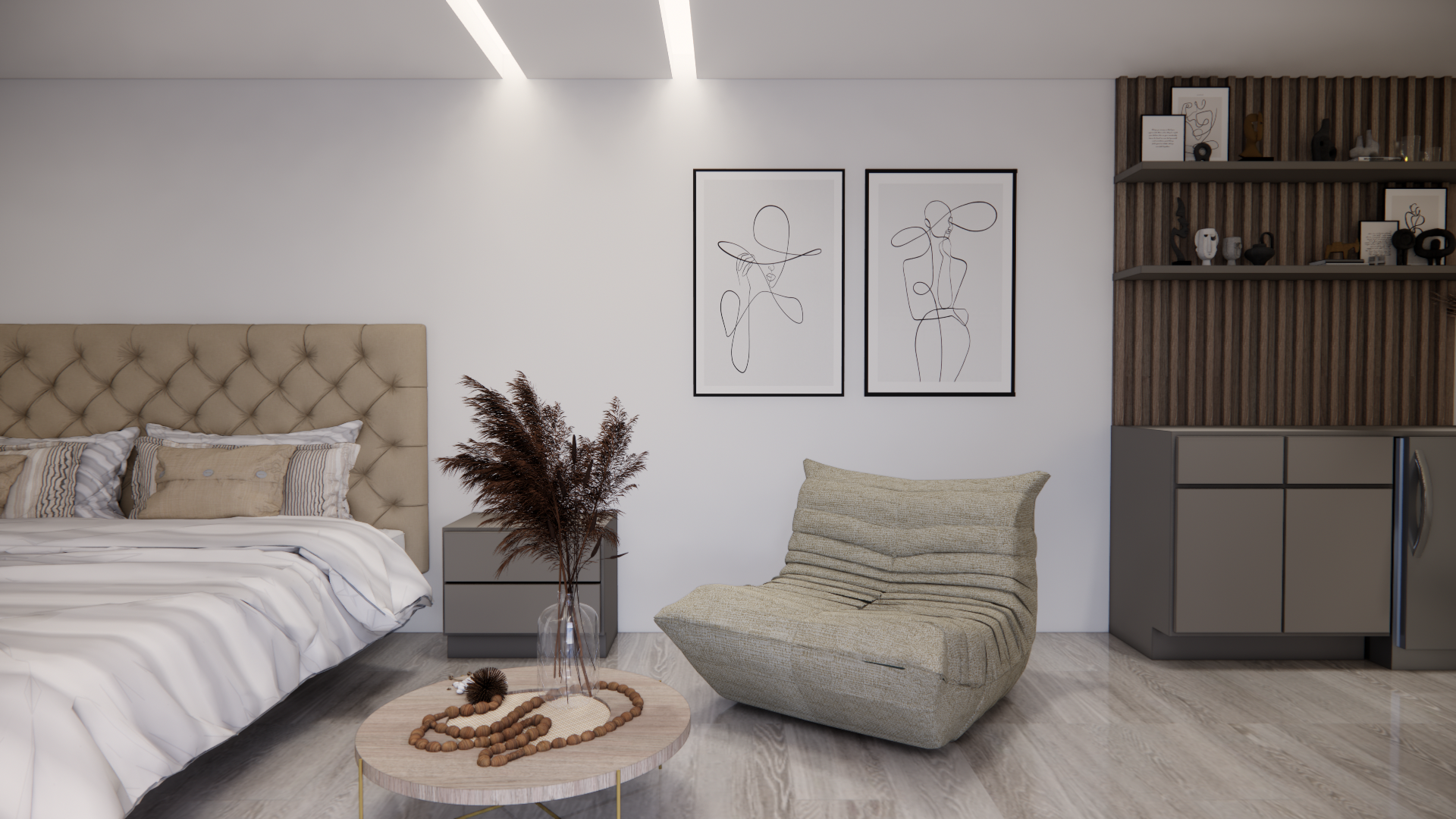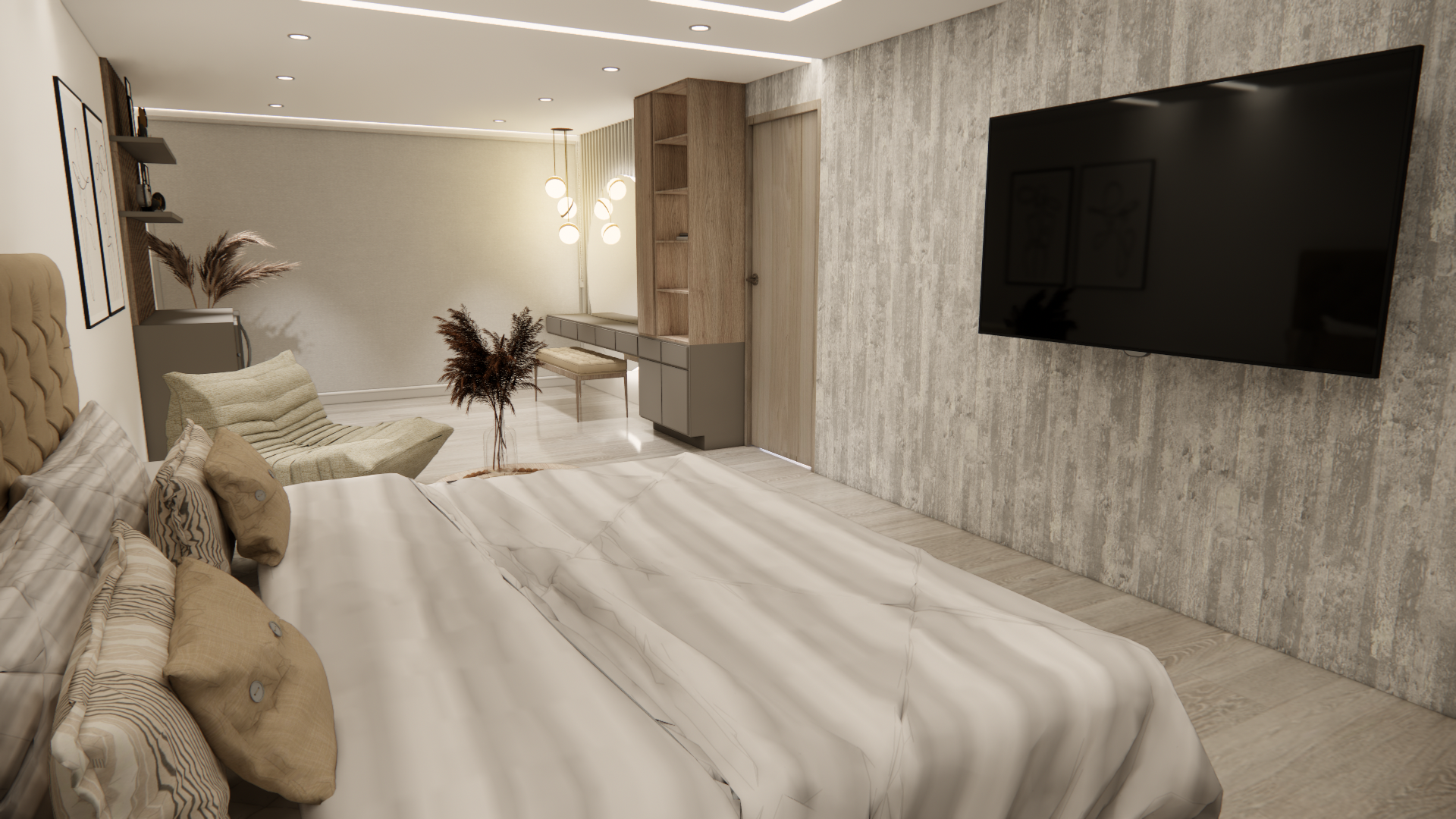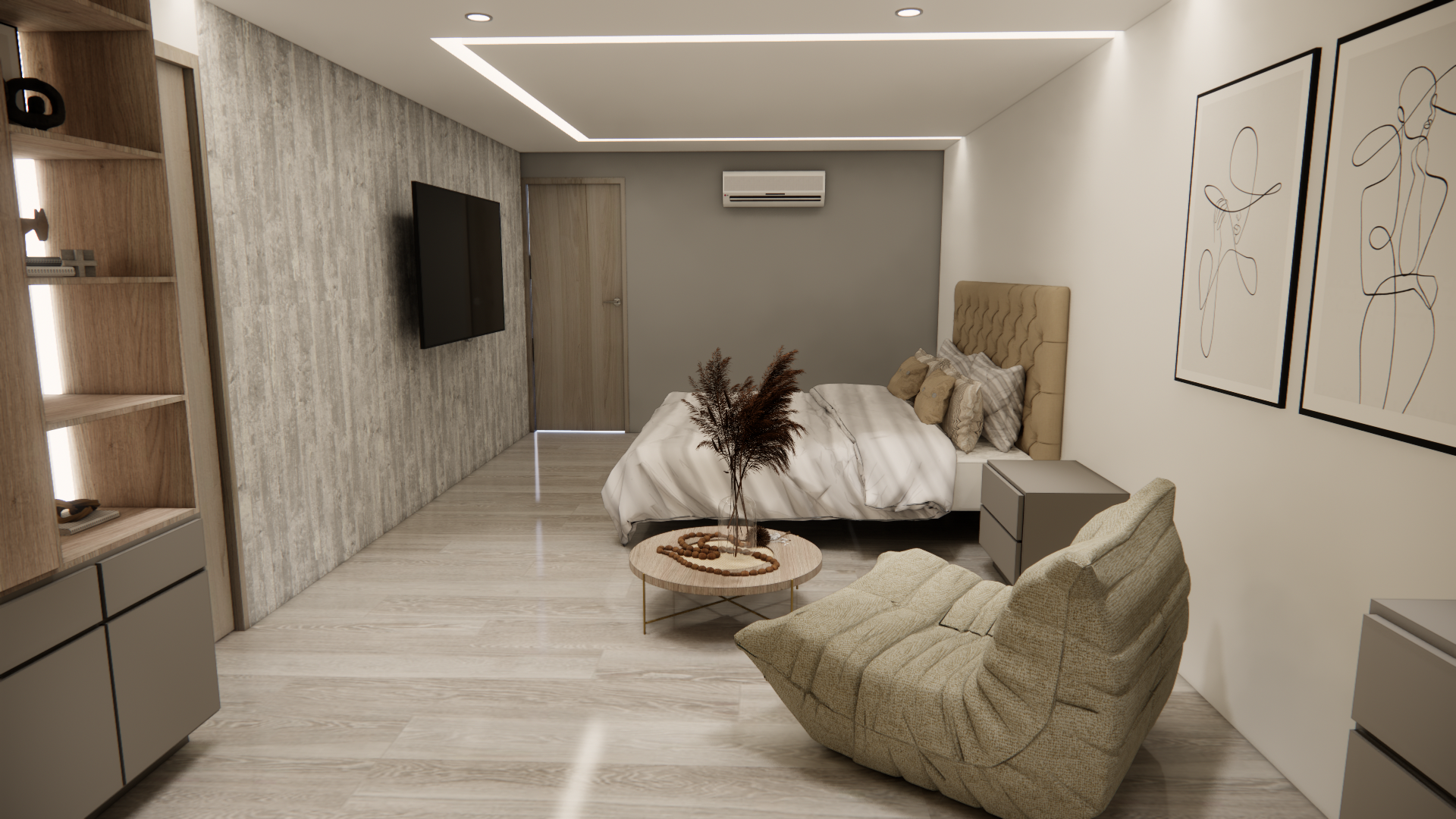 El diseño de un dormitorio debe ser el refugio definitivo, un espacio donde la estética y el descanso converjan en armonía. En esta propuesta residencial, nos enfocamos en crear un ambiente que equilibra la elegancia con una funcionalidad impecable, utilizando una paleta de tonos neutros grises, greige y maderas cálidas para lograr una atmósfera de modernidad absoluta.